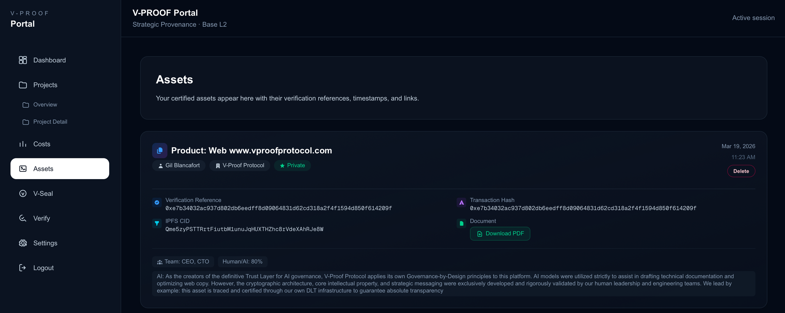 - Declaración de Autoría (Human-in-the-loop): Se genera una nueva versión del activo donde se define el "V-SEAL" humano/IA, estableciendo exactamente qué porcentaje del trabajo ha sido asistido por algoritmos y qué porcentaje es autoría y dirección humana.